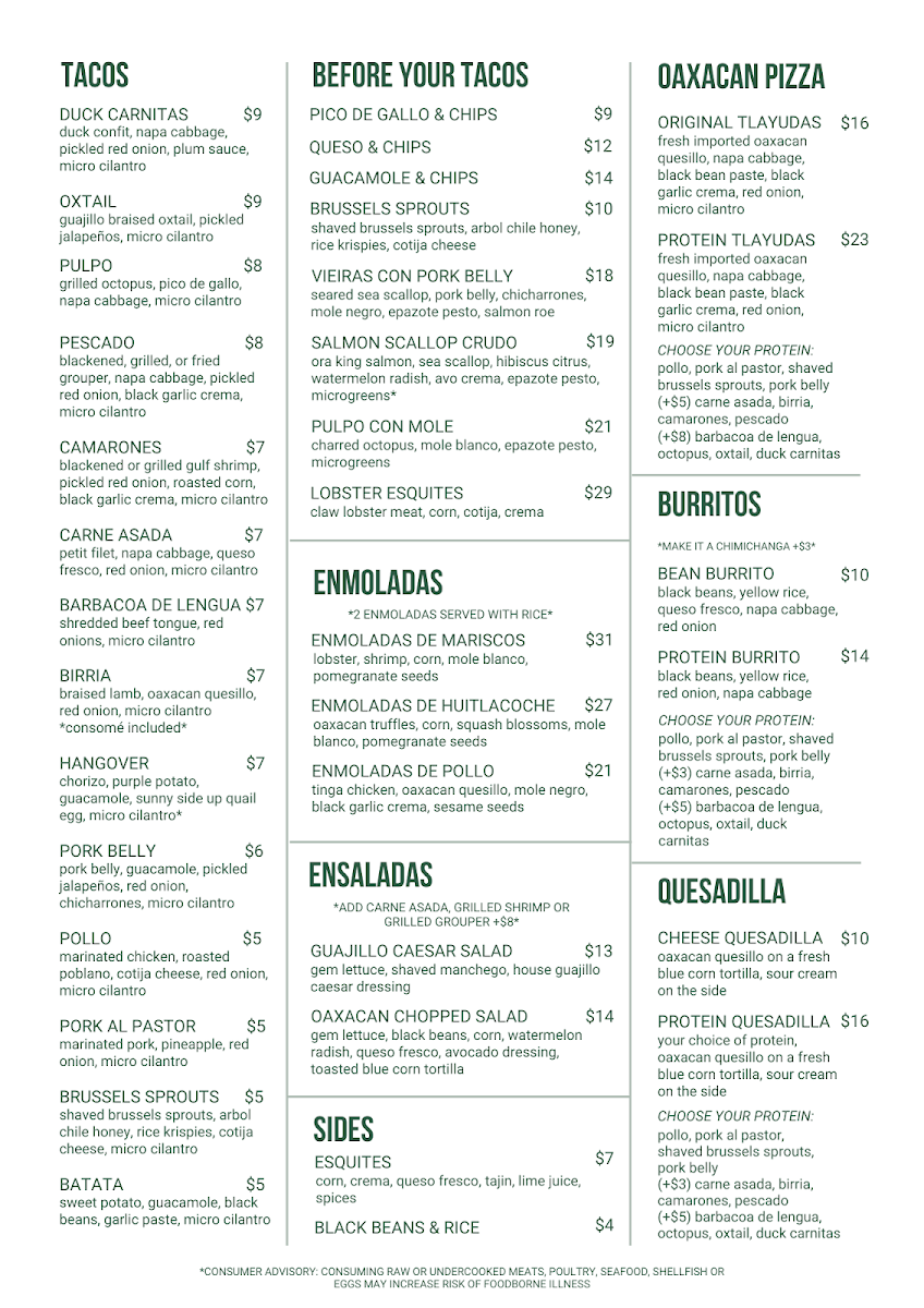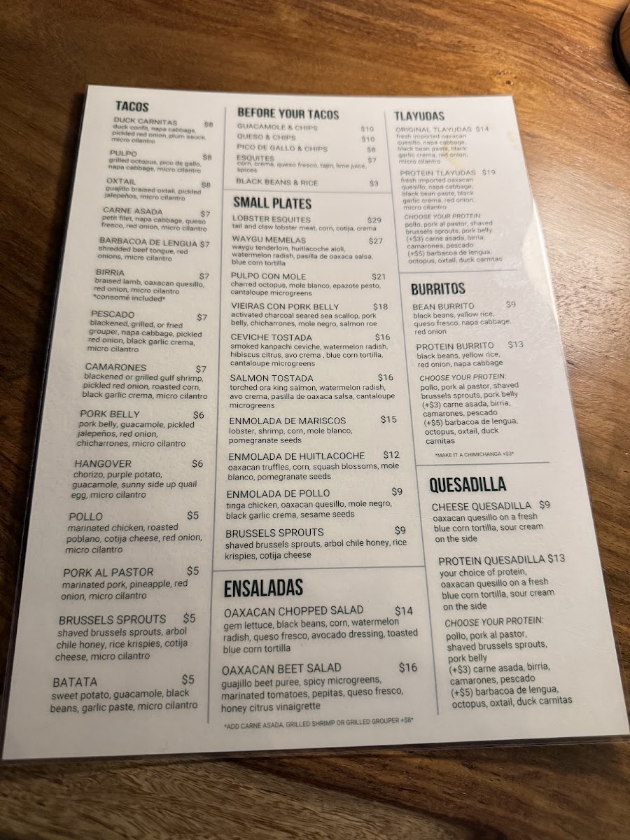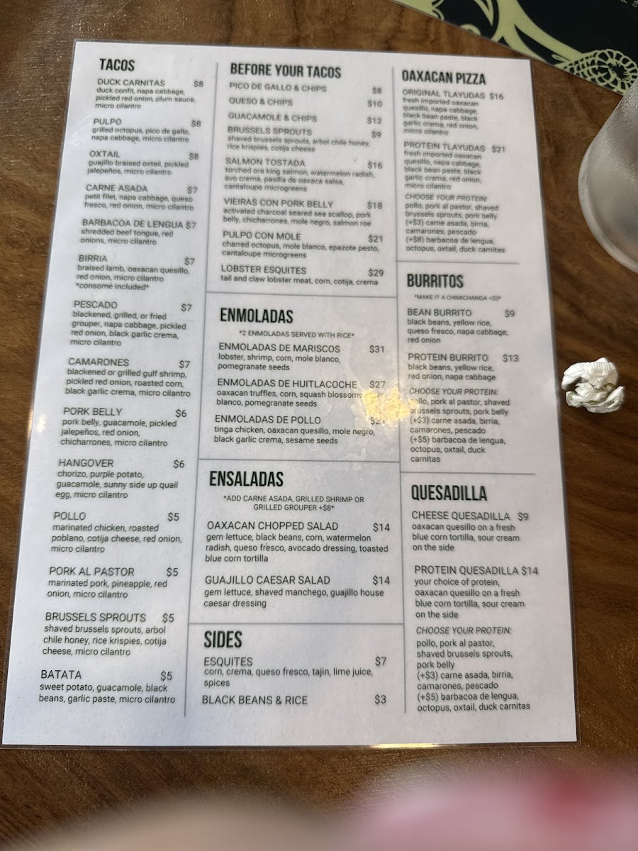 Fresh imported Oaxacan quesillo, napa cabbage, black bean paste, black garlic crema, red onion, and micro cilantro
