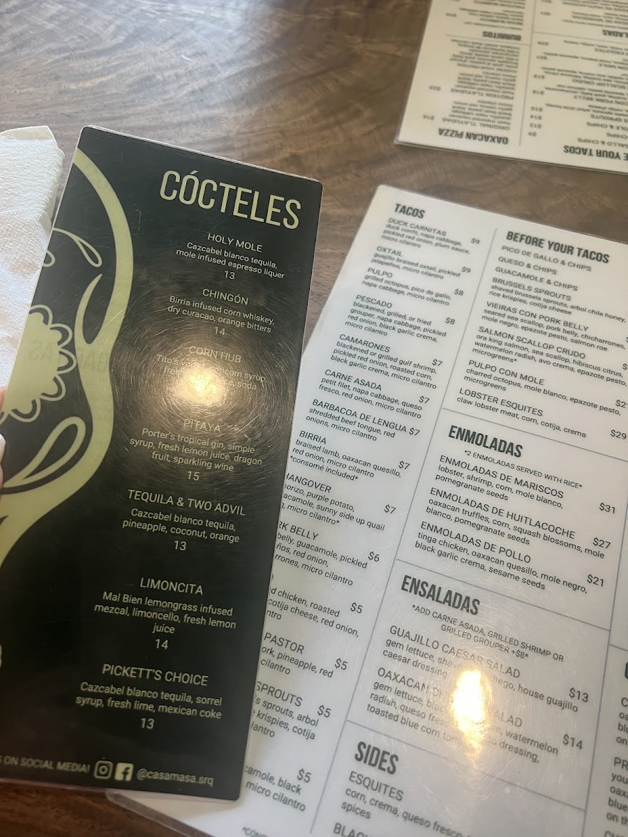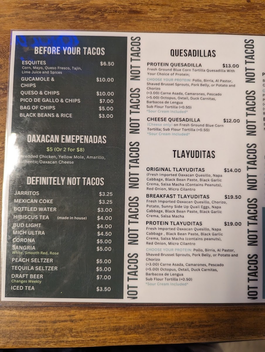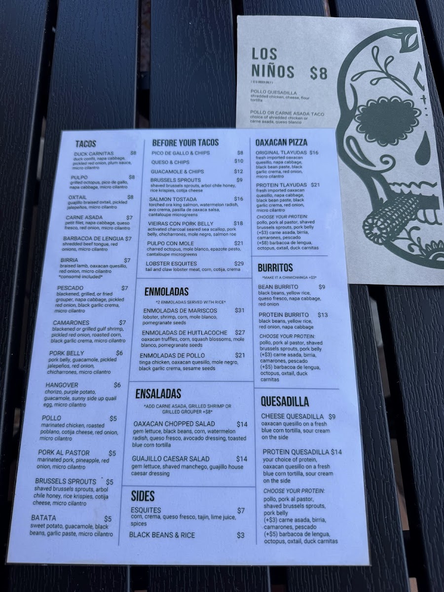 Fresh imported Oaxacan quesillo, napa cabbage, black bean paste, black garlic crema, red onion, and micro cilantro